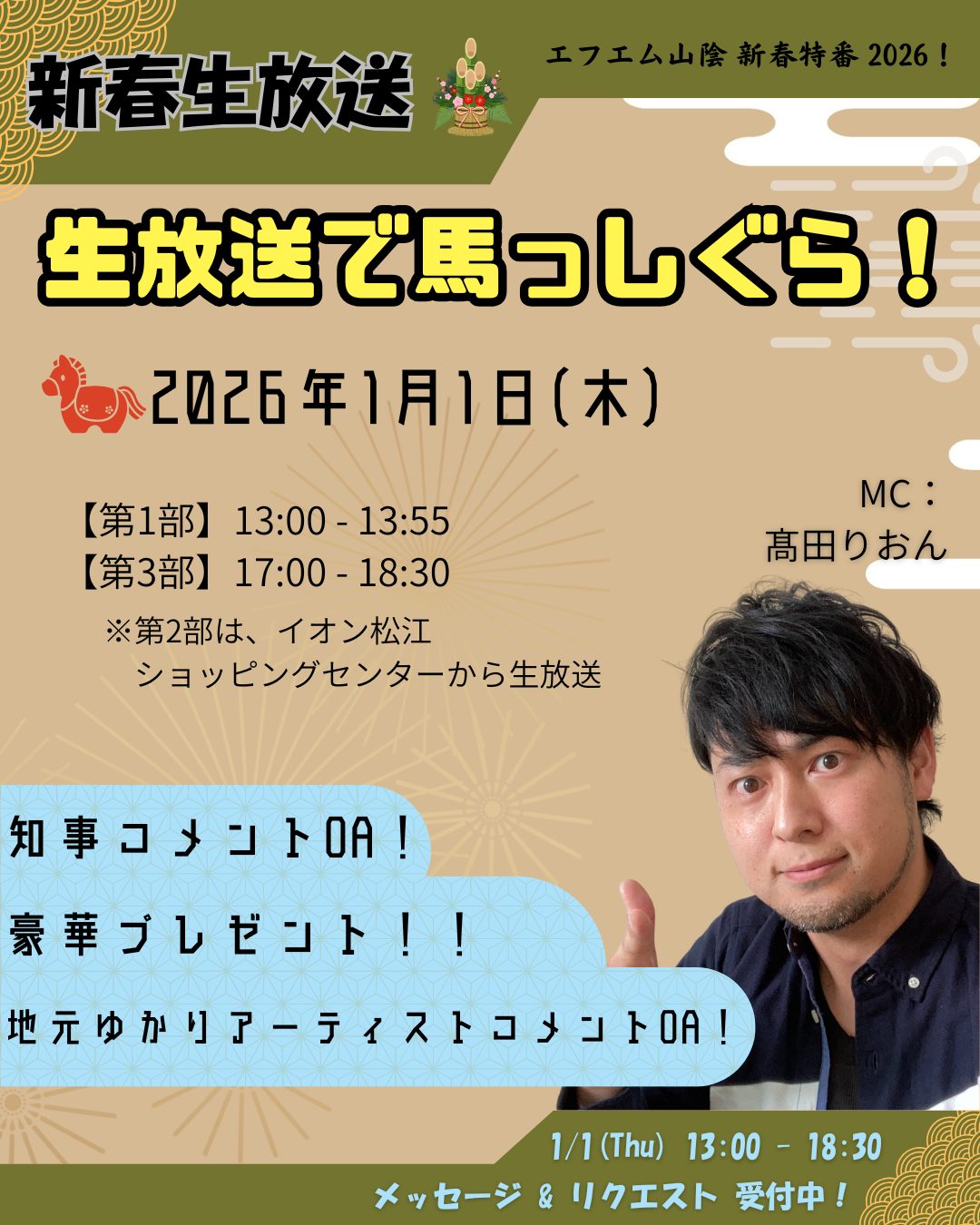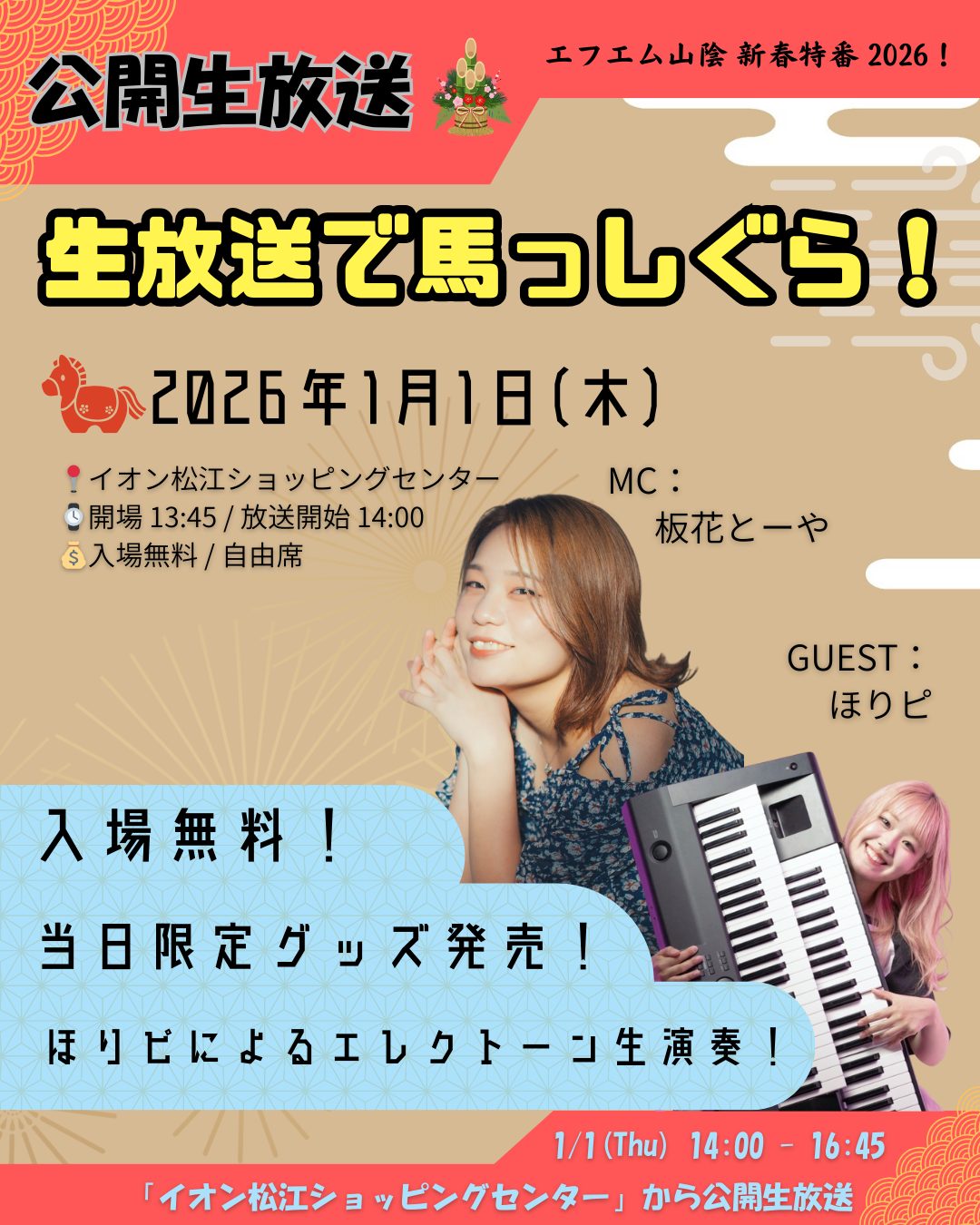 スタジオからは髙田りおん、松江イオンからは板花とーやが、みなさんのお正月を彩ります。そして公開生放送のゲストには、「板花とーやのFRIDAY×FRIDAY」でもおなじみ、米子のおしゃべりエレクトーン奏者 ほりピ が登場し、エレクトーンの生演奏も披露!2026年をお正月からまっしぐらに駆け抜ける新春特番!お楽しみに!